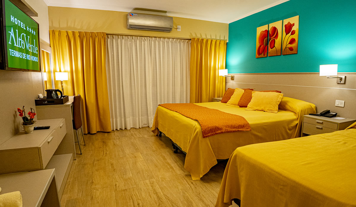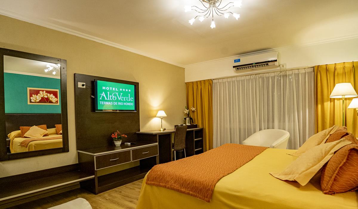 Si tu elección es una SUITE JUNIOR, la misma cuenta con el mejor equipamiento y estará a la altura de tus exigencias ya que tiene: escritorio, WiFi y teléfono para que puedas trabajar y relajarte al mismo tiempo. Ambiente climatizado y living; camas King size, TV LED pulgadas, caja de seguridad, batas y frigo bar. Además de baño completamente equipado con hidromasaje de agua termal.
